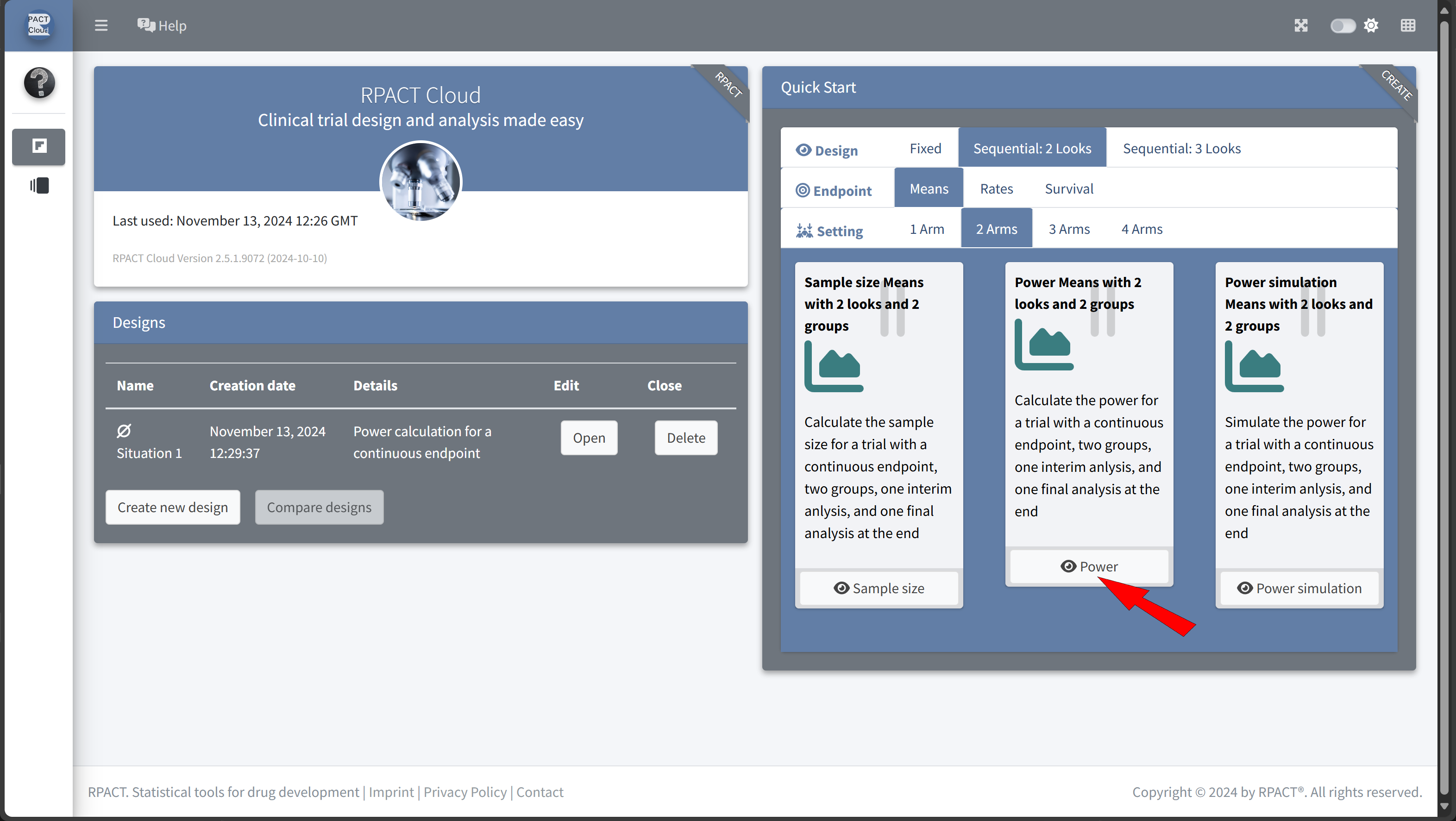 Using the rpact package, we can calculate the power of the study under the defined parameters. Here’s how: